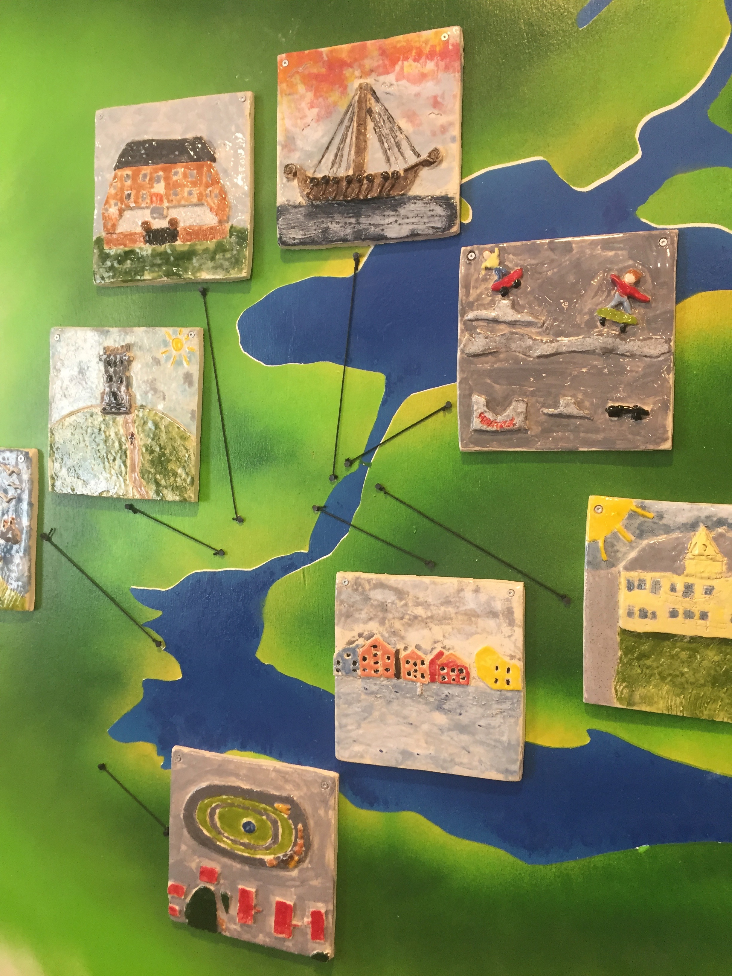 Mural made with pupils at Tønsberg Montessori School for the entrance hall of their school. Handmade ceramic tiles depicting local landmarks within 10 km of the school.